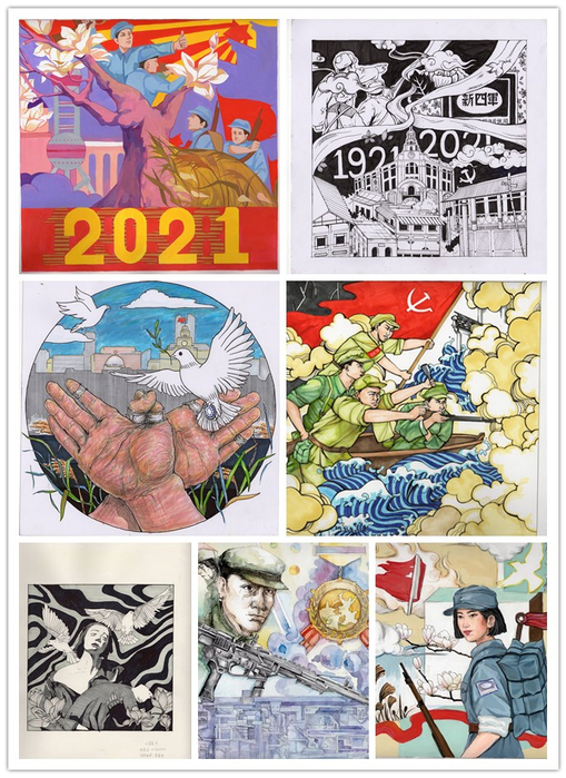 在学院党委的引领下,学院教师坚持立德树人,充分发挥课堂育人的主渠道作用,积极探索党史学习教育融入教育教学全过程的新途径。视传系主任彭波教授指导学生以“建党百年”为主题开展毕业设计,相关视觉形象海报和衍生产品在毕业季展览时让人眼前一亮。美术学部主任李海峰副教授、李军平副教授在《图案设计》的艺术类基础课上,带领大一学生围绕新四军题材进行图案设计,将课程上成了富有深意的艺术特色党史学习课。在老师的指导下,同学们积极收集、学习新四军相关历史资料,在深入了解的基础上进行了艺术创作。师生们很自然地把党史学习教育的使命和专业课、基础课的教学目标有机结合起来,使党史学习教育更加鲜活,更加生动。
